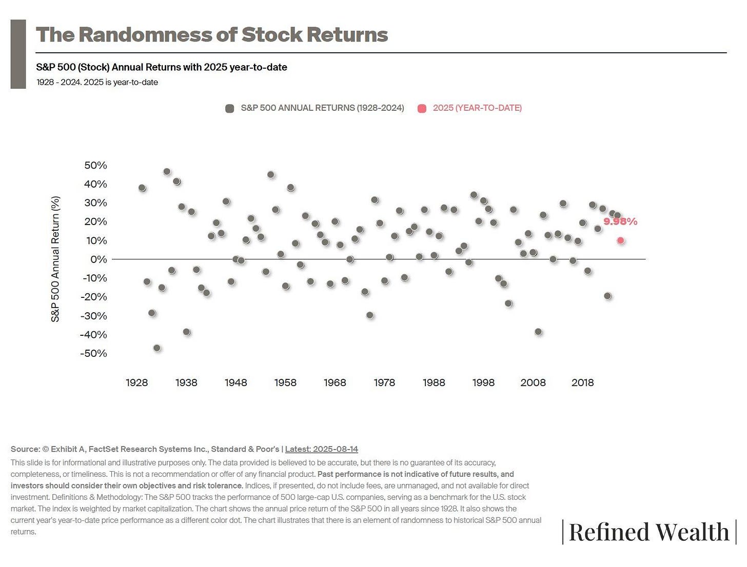 Since 1926, the S&P 500 has averaged 10% annual returns. But here’s the catch: the S&P 500 Index had a return within the 8-12% range in only 6 of the past 93 calendar years. (The Uncommon Average)