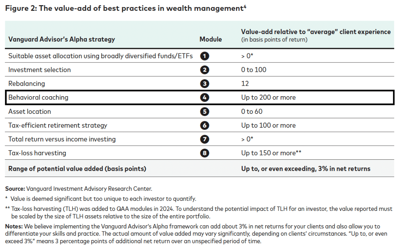 Vanguard’s Advisor Alpha “Potential value-add: Vanguard research and other academic studies have concluded that behavioral coaching may add 100 to 200 bps (1-2%) in net return. Providing discipline and guidance could be the largest potential value-add of the tools available to advisors.”