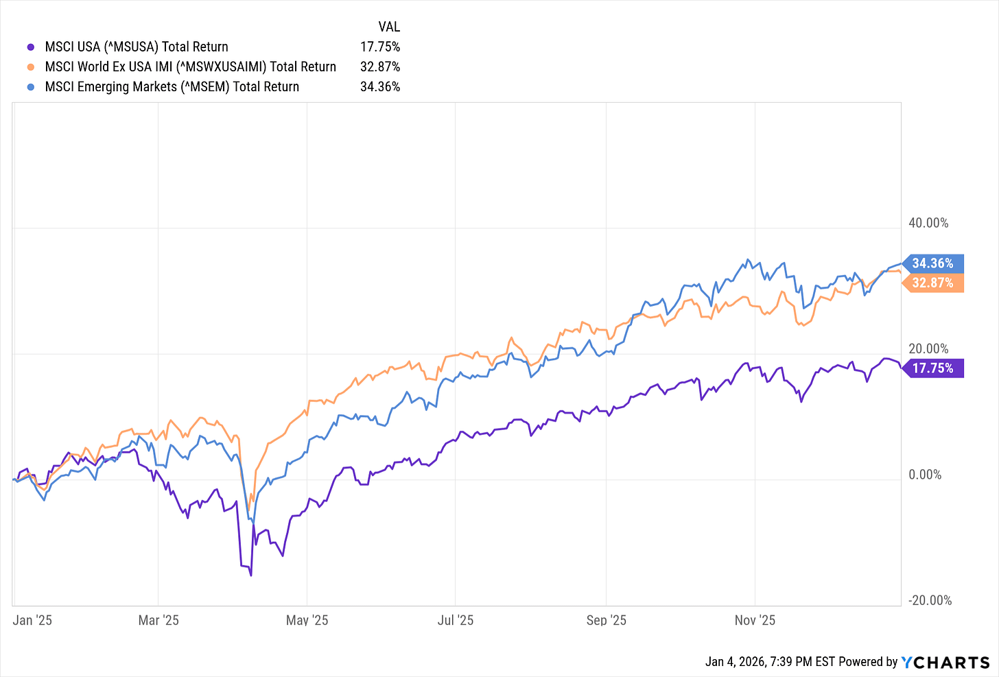 Since we can’t predict which markets will lead in any given year, diversification becomes essential. 2025 proved this perfectly: while the US markets had another strong year (purple line), international and emerging markets performed twice as well (orange and blue lines, respectively). A prudent allocation includes some portion of all three to capture the entire market. No prediction required.