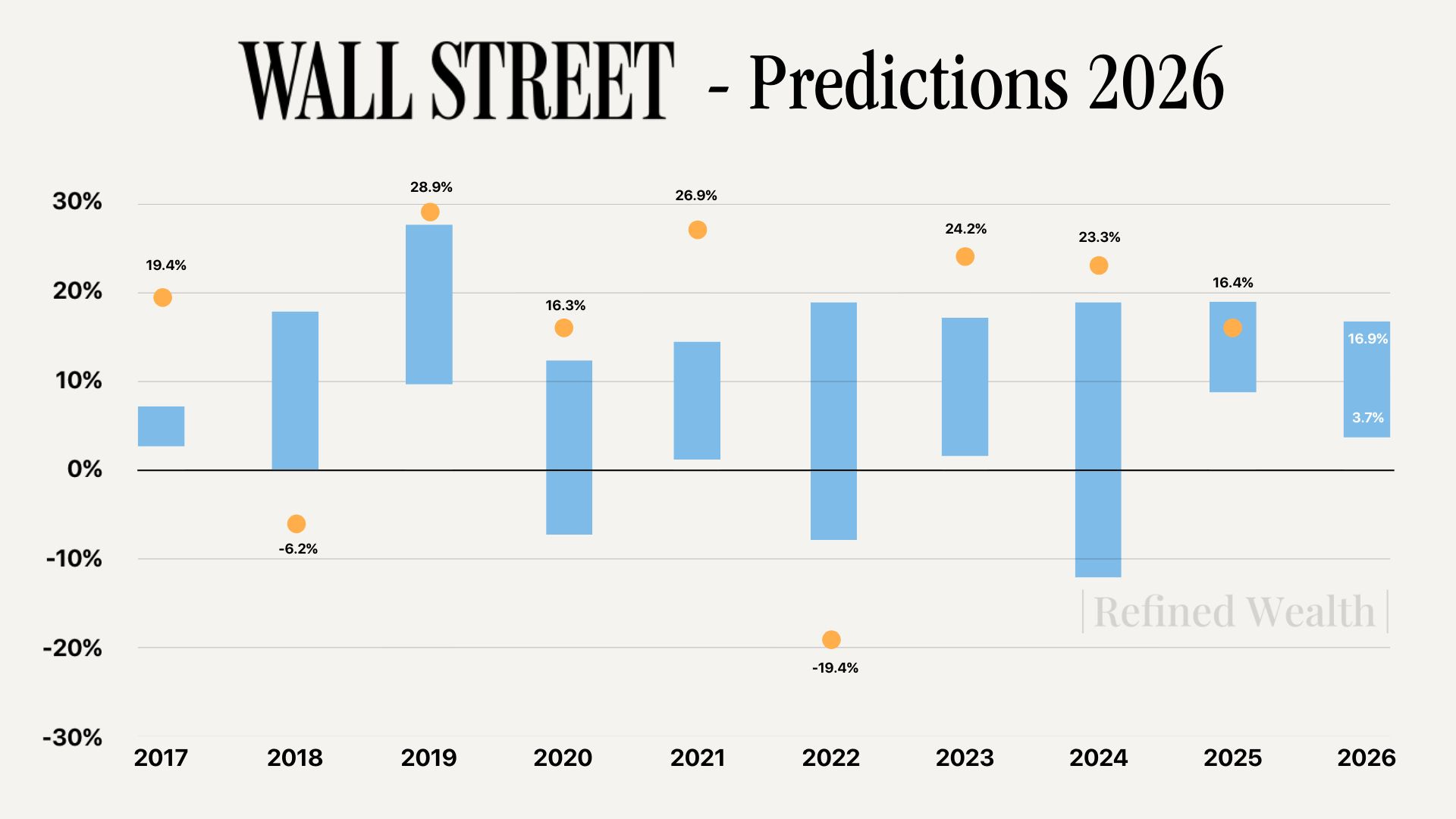 The blue bars below represent the range of predictions across the big banks for the year ahead. The orange dots represent the actual returns.